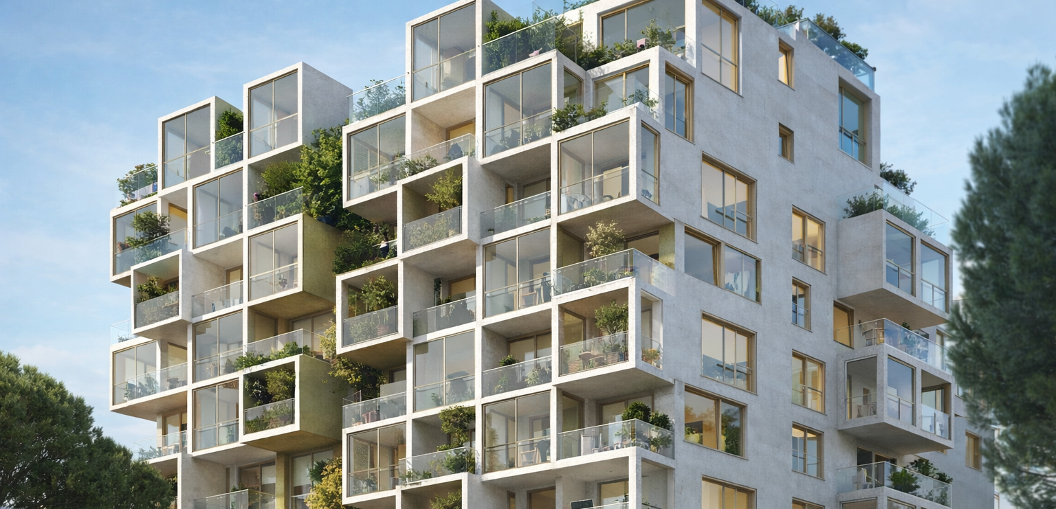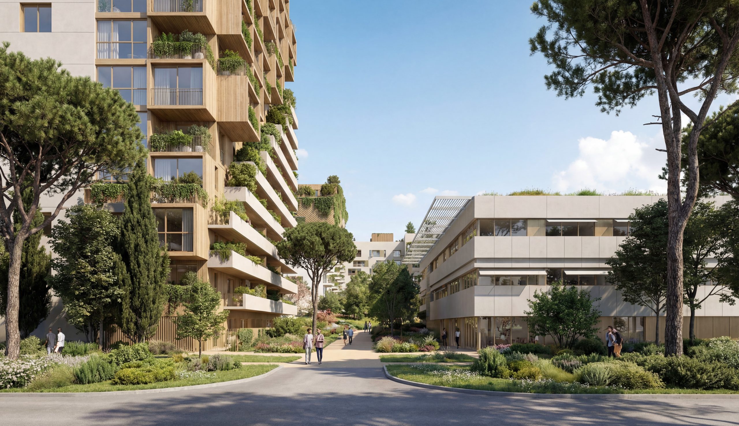 L’Îlot des Platanes ne se contente pas de créer des espaces verts au sol. Le projet développe une stratégie de végétalisation verticale unique à Lattes.